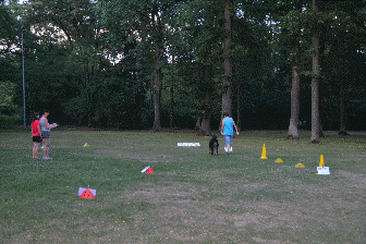 Fun-Sportart Rally-Obedience. Dabei wird ein Parcours aus verschiedenen